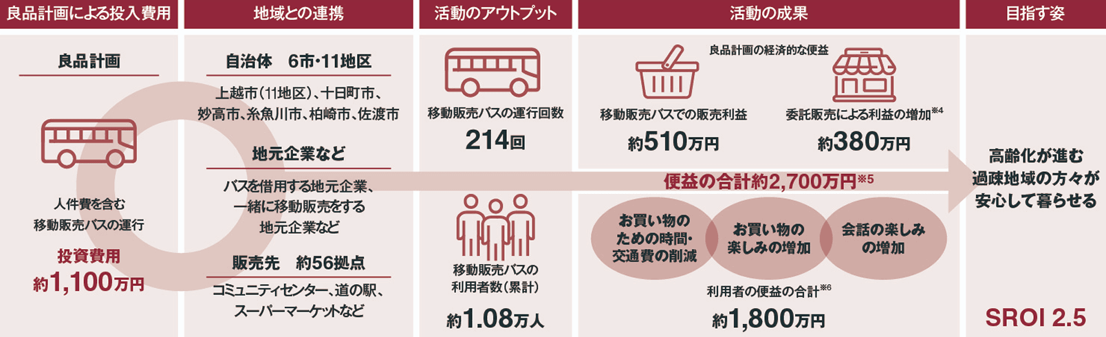直江津での移動販売バスの運行開始から4年目となる2024年8月期における1年間の活動を評価対象としました。運行費用約1,100万円(投資費用)に対し、活動の成果の合計は約2,700万円(便益)であり、SROIは2.5でした。アンケート結果から、お客さまは無印良品の店舗や市街地に移動するための時間・交通費がかからずに近所でお買い物ができること、またお買い物をする場所が少ない地域においてお買い物の楽しみが増えることに喜びを感じる方が多く、この取り組みの利用者のメリットを金額にすると1人当たり年間約1,700円となりました。また、経済的な便益では、移動販売バスをきっかけに、自治体施設などで常設の委託販売先が増えたことで販売利益が前期よりも増加しました。お客さまからは、商品の品揃え拡充などのご要望をいただいており、今後も改善を進めていきます。