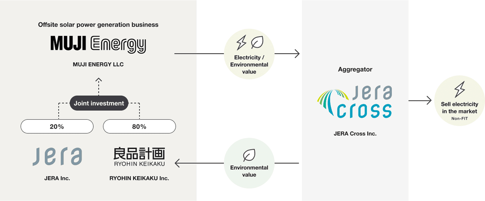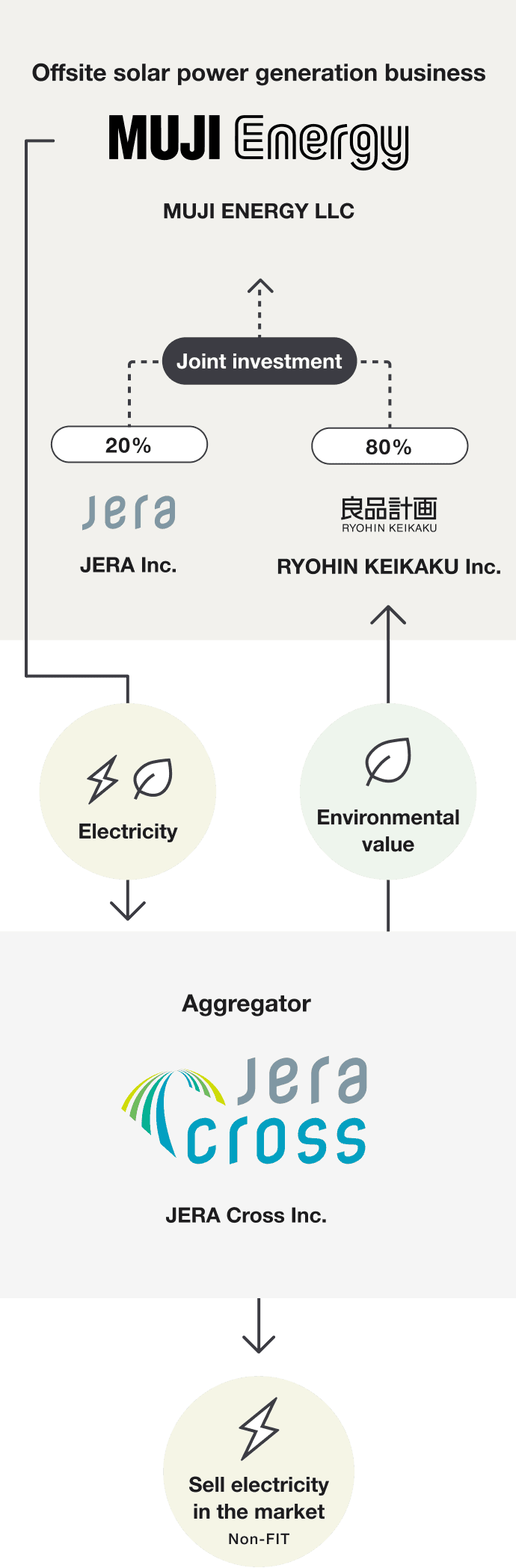 In June 2025, Ryohin Keikaku announced that it will establish MUJI Energy LLC, a special purpose company to engage in the renewable energy power generation business, including the development of solar power generation facilities, in a joint venture with JERA Co., Inc. The environmental value and electricity generated from solar power through MUJI Energy will be purchased by JERA Cross Co., Inc. The electricity will then be supplied to Japan Electric Power Exchange (JEPX), and all of the environmental value will be acquired by Ryohin Keikaku. Ryohin Keikaku will utilize the environmental value to reduce CO2 emissions associated with electricity consumption in its business activities, including at MUJI tenant stores and other locations. MUJI Energy plans to develop approximately 13 MW of power generation capacity within one year of establishment. This is equivalent to 20% of MUJI’s annual electricity consumption and it is expected to reduce CO2 emissions by approximately 8,000 t per year.
