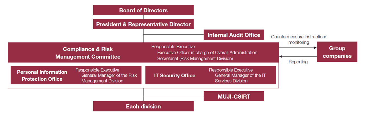 At Ryohin Keikaku, the Compliance and Risk Management Committee, which is chaired by a senior executive officer who is in charge of overall administration, oversees relevant activities of the Group based on its basic policies. The committee has established the IT Security Office and Personal Information Protection Office to accurately grasp the status of information security and to discuss and promote countermeasures. Each Group company and division appoints a person in charge of information security and strives to strengthen and thoroughly implement the information management system.