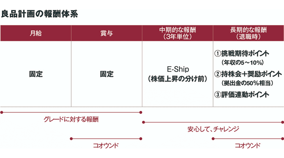 良品計画グループでは、従業員持株会制度を導入しています。従業員自身が良品計画の株主=オーナーとなることで、事業活動の結果向上した企業価値が従業員一人ひとりに還元され、好循環が生まれることを目指します。退職時に給付される長期型の「株式給付信託(ESOP)」と、株価に応じた3年間単位での分配金が支給される中期型の「信託型従業員持株インセンティブ・プラン(E-Ship)」の2つのインセンティブがあり、いずれもパートナー社員を含む社員が対象です。ESOPにおいては、拠出金の50%相当が従業員向けの持株会奨励ポイントとして給付されます。また、持株会の加入によらず、従業員の高いレベルでの挑戦に対し、退職時に自社株に変換されるESOPポイントが給付される「挑戦期待ポイント」制度もあります。誰もが挑戦することを楽しみ、積極的な行動が賞賛される組織を目指すと同時に、挑戦を通して従業員自身がより多くの人と関わり強い信頼関係を構築していくことを目的としています。立候補および上司推薦に基づき、個人またはチームで半期ごとにチャレンジする内容を全社に宣言したうえで取り組み、進捗の確認とともにポイントが付与される仕組みです。