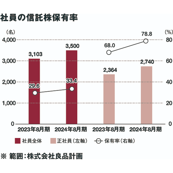 良品計画は、「社会や人の役に立つ」という根本方針のもと、従業員一人ひとりがオーナーシップを持ち事業活動の主役となり、自律的・自発的に行動し、その活動が公益に寄与することで「感じ良い暮らしと社会」が実現される、「公益人本主義経営」を目指しています。「公益人本主義経営」を実現していくためには、従業員の経営参画意識=オーナーシップの醸成、そして従業員が安心して中長期的なチャレンジができる環境づくりが重要であるとの考えのもと、コオウンド経営を進めています。