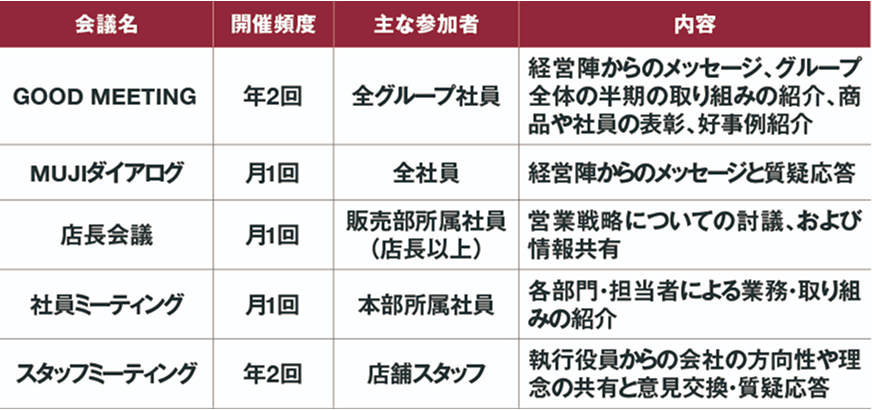 2024年8月期からは、全国の店舗スタッフと執行役員の対話の場として、「スタッフミーティング」の開催を強化しています。スタッフミーティングとは、国内勤務の全執行役員約20名が全国の無印良品の店舗に赴き、経営陣と店舗スタッフが対話する場を設けるものです。お客さまの声や店舗の声を伝えたい、そしてそれをもとに現状を良く変えていきたいという意思のある従業員であれば誰でも参加可能です。このミーティングでは、経営陣が良品計画の理念や方針を店舗スタッフに共有すると同時に、店舗の現状をヒアリングし認識したうえで、良品計画が目指す姿の実現に向けてディスカッションを行います。また、お客さまのご要望や店舗の困りごとをタイムリーかつ詳細に吸い上げることにもつながっています。
