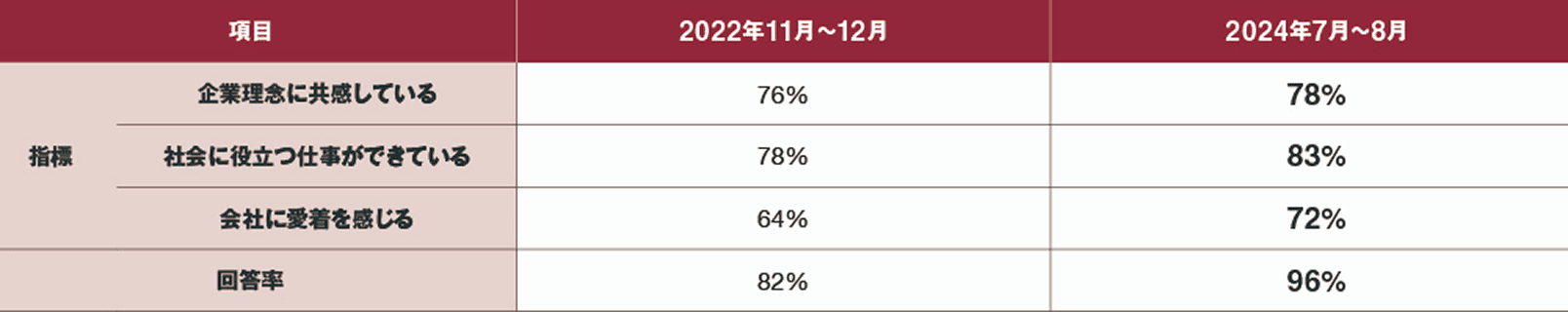 良品計画では、「企業理念に共感している」「社会に役立つ仕事ができていると感じる」「会社に愛着を感じる」の3つの指標を「感じ良い暮らしと社会」の実現を目指す当社の原動力として注視しています。いずれの指標も、あらかじめ設定された関連設問の回答結果より算出しています。2022年の調査より、これらの指標および回答率において結果の向上が見られました。
