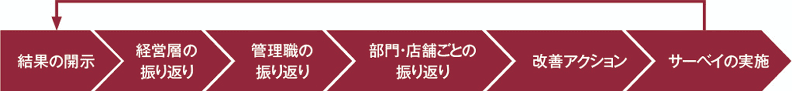 調査結果をもとに、組織や役職単位で協議を重ねることで、課題の分析・特定・改善を図っています。2022年の調査結果からは、会社の目指す方向性の社員への共有、強い信頼関係で結ばれたチームづくり、人員不足や業務過多による店舗負荷の大きさ、安心して働ける環境や制度の整備などに対する課題が浮かび上がりました。特定された課題に対し、経営層と従業員および従業員同士のコミュニケーション機会の増加、店舗オペレーションおよびITインフラの改善、報酬システムの大幅な見直しをはじめとする改善施策を進めてきました。また、各店舗単位でも店長が課題に取り組み、チームメンバーに直接働きかけたことで、2024年の調査結果の改善につながっています。今後も、一人ひとりの従業員にとってより良い職場環境となることを目指し、調査を活用しながら、継続的な改善に取り組んでいきます。