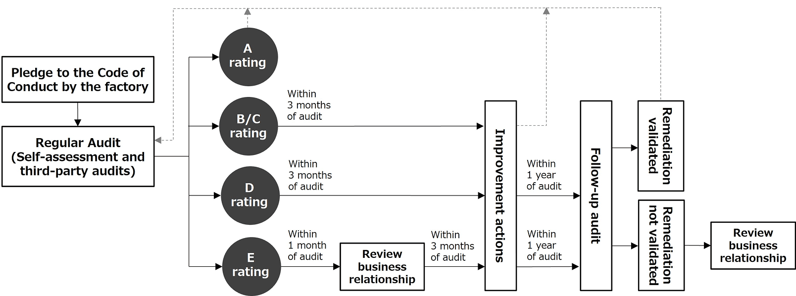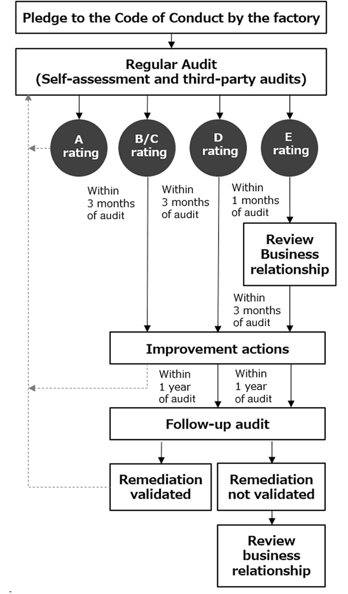 For factories where the risk assessment has been rated as D or E through the audit, follow-up audits will be conducted focusing on the issues identified. If the remediation of identified issues is not validated during follow-up audits, Ryohin Keikaku will carefully review the possibility of reassessing the business relationship in meetings attended by inside directors, taking into account the factory’s management and employment conditions. If, as a result of human rights due diligence throughout the supply chain, including on-site audits, serious human rights violations are confirmed, and if corrective action cannot be expected even if Ryohin Keikaku exerts its influence, the termination of the business relationship with the factory will be considered as an option in accordance with the Code of Conduct for Production Partners.