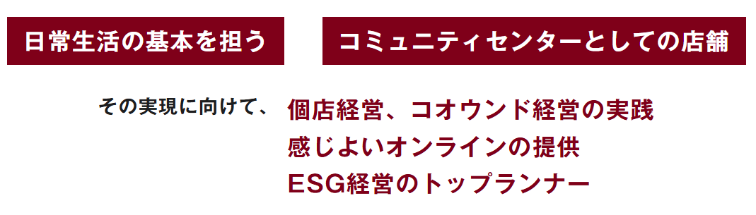 また2021年7月に、100年後のより良い未来を見据えて、2030年までのビジョンを策定・公表いたしました。個店を通じて、日常生活の基本を担うと共に、地域社会と共生し課題解決や町づくりに貢献していきます。