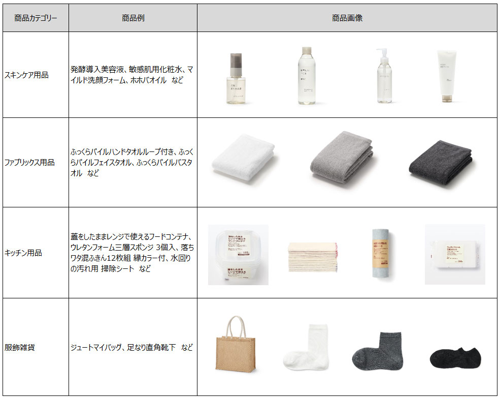 取り扱い商品は、全国の無印良品でも人気のスキンケア用品や靴下をはじめ、タオル類や調理小物など、約70アイテムを取り扱います。今後、ラインナップをさらに拡大していきます。