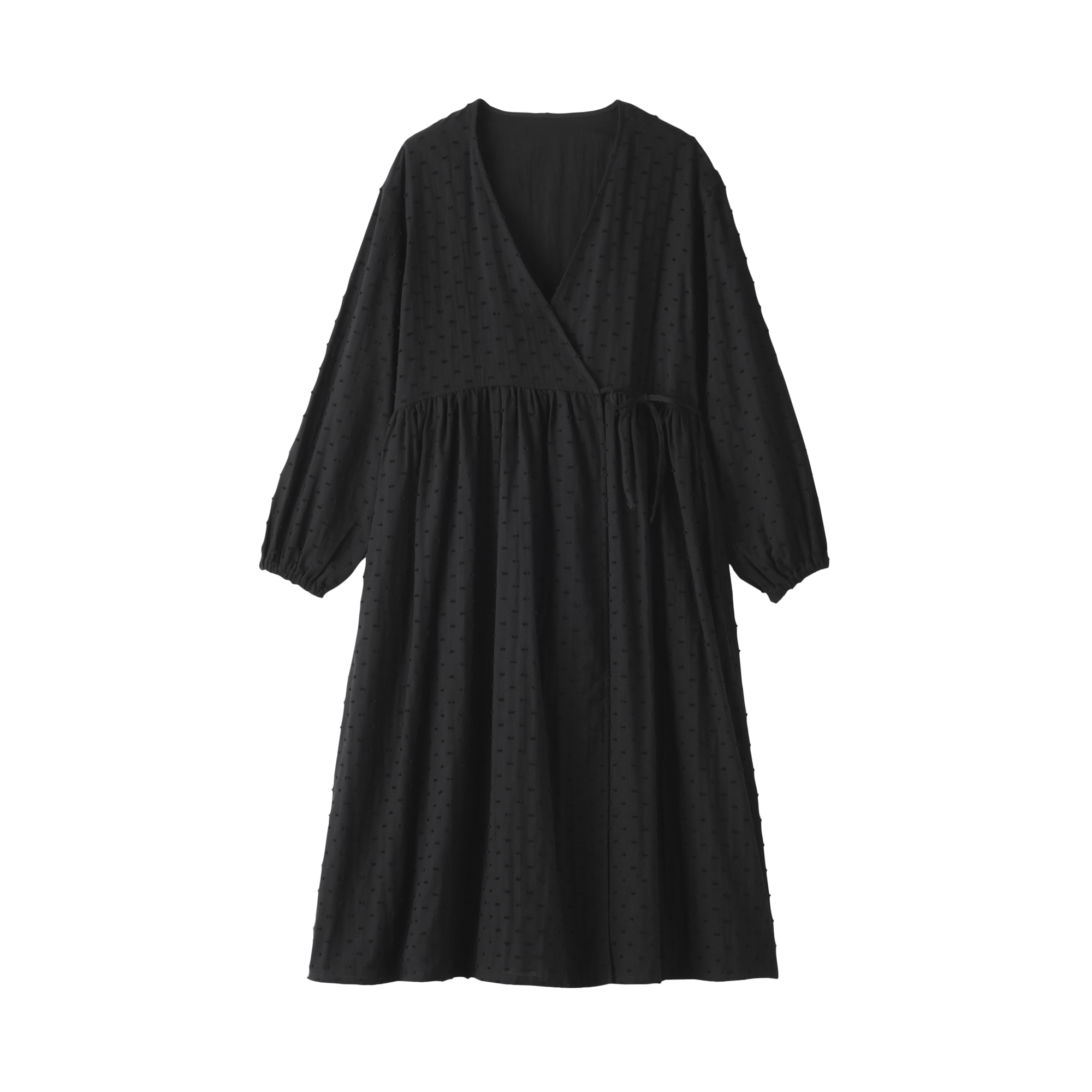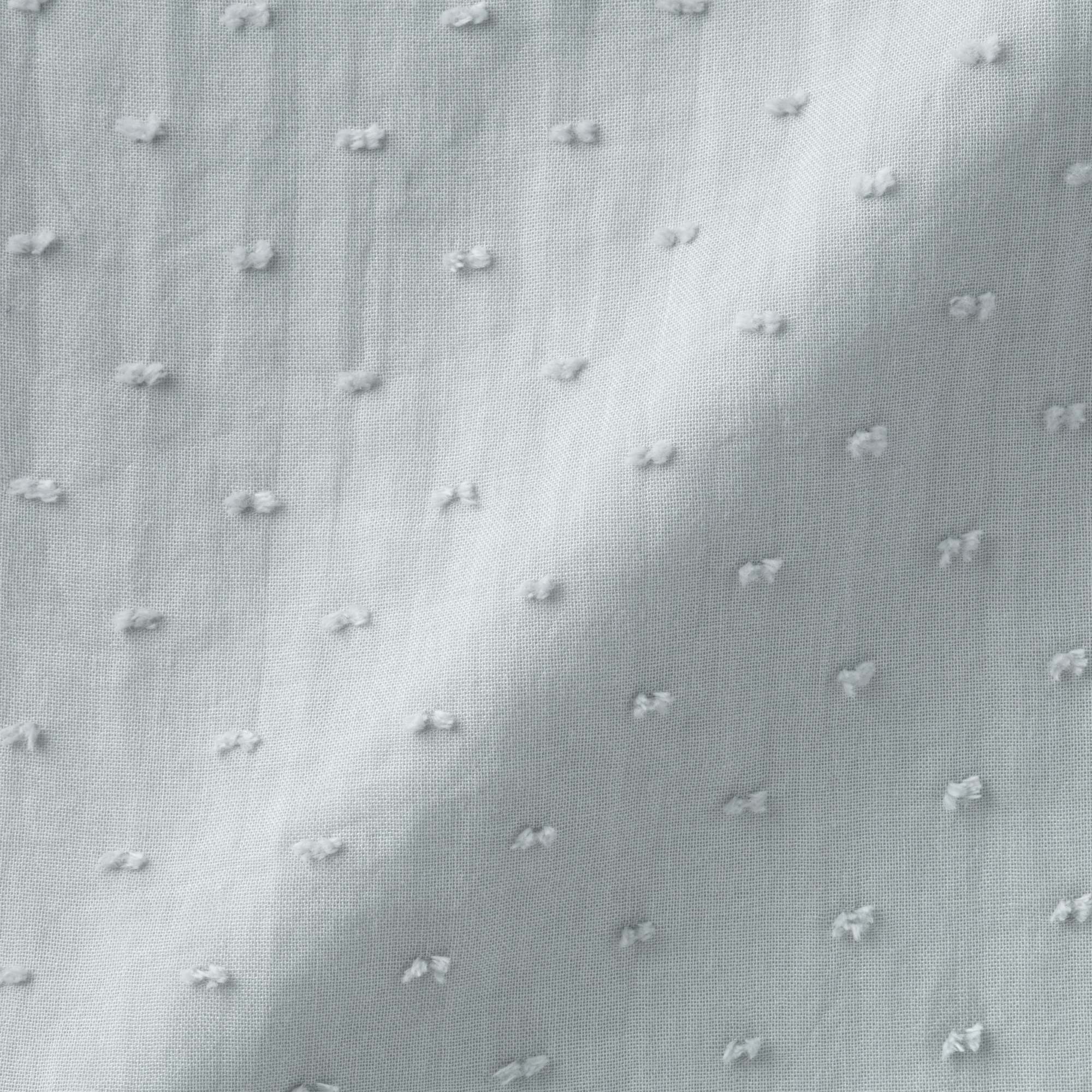 オーガニックコットン100%で二重ガーゼ生地をベースに凹凸のあるドビー織りでドット柄の表情を加えました。やわらかく肌なじみのよいガーゼに軽やかな立体感が生まれ、シンプルながら上品な印象の素材です。