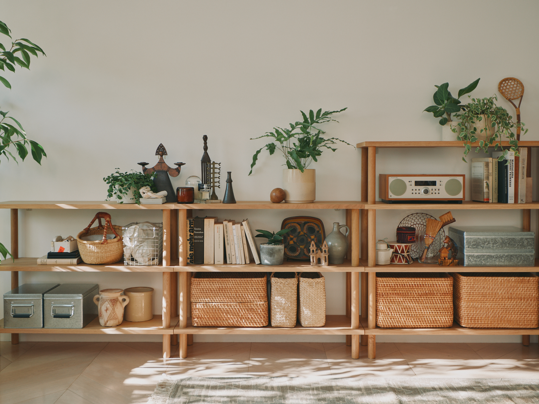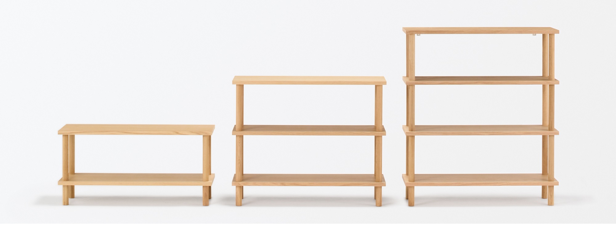 棚板に脚をくるくると回して取り付けるだけで簡単に組み立てられるので、持ち帰ってすぐに使い始められるコンパクトな木製シェルフです。背板と側板がないオープンタイプなので、圧迫感なくお部屋に置くことができます。高さは棚2段、棚3段、棚4段の3種類をご用意しました。どんな空間にも馴染みやすいオーク材※を使用しています。