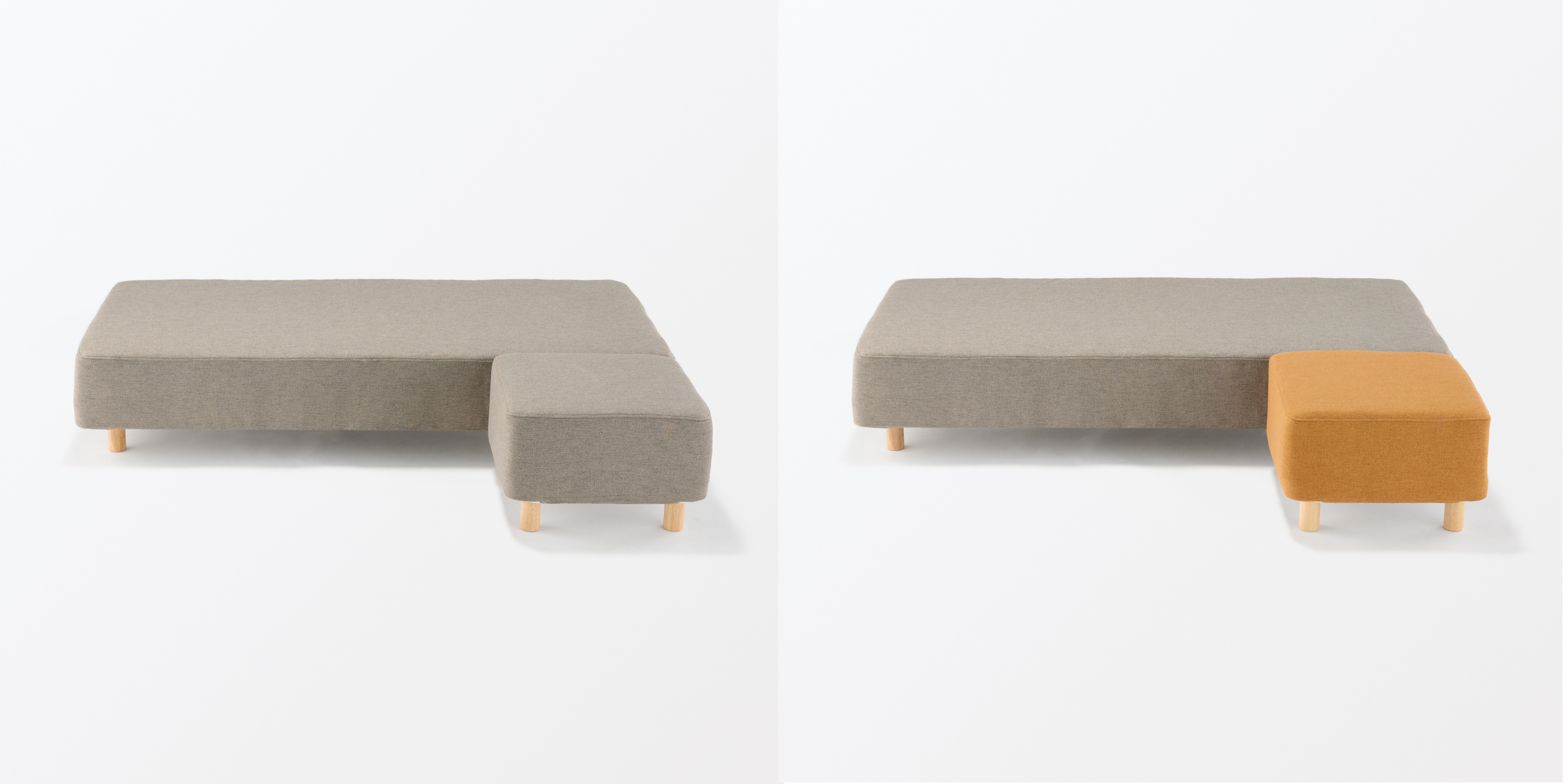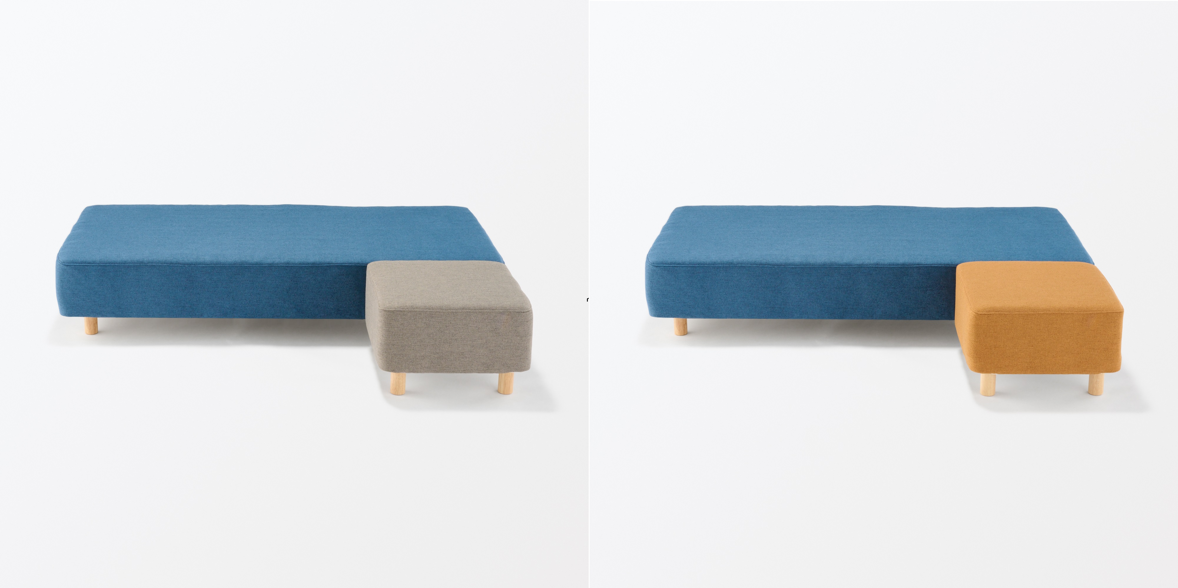 同じ構造のスツールも用意していますので、組み合わせてカウチソファやオットマンのように使うこともできます。同色で組み合わせるだけでなく、お部屋のアクセントにもできるようにカラーバリエーションをもたせました。
