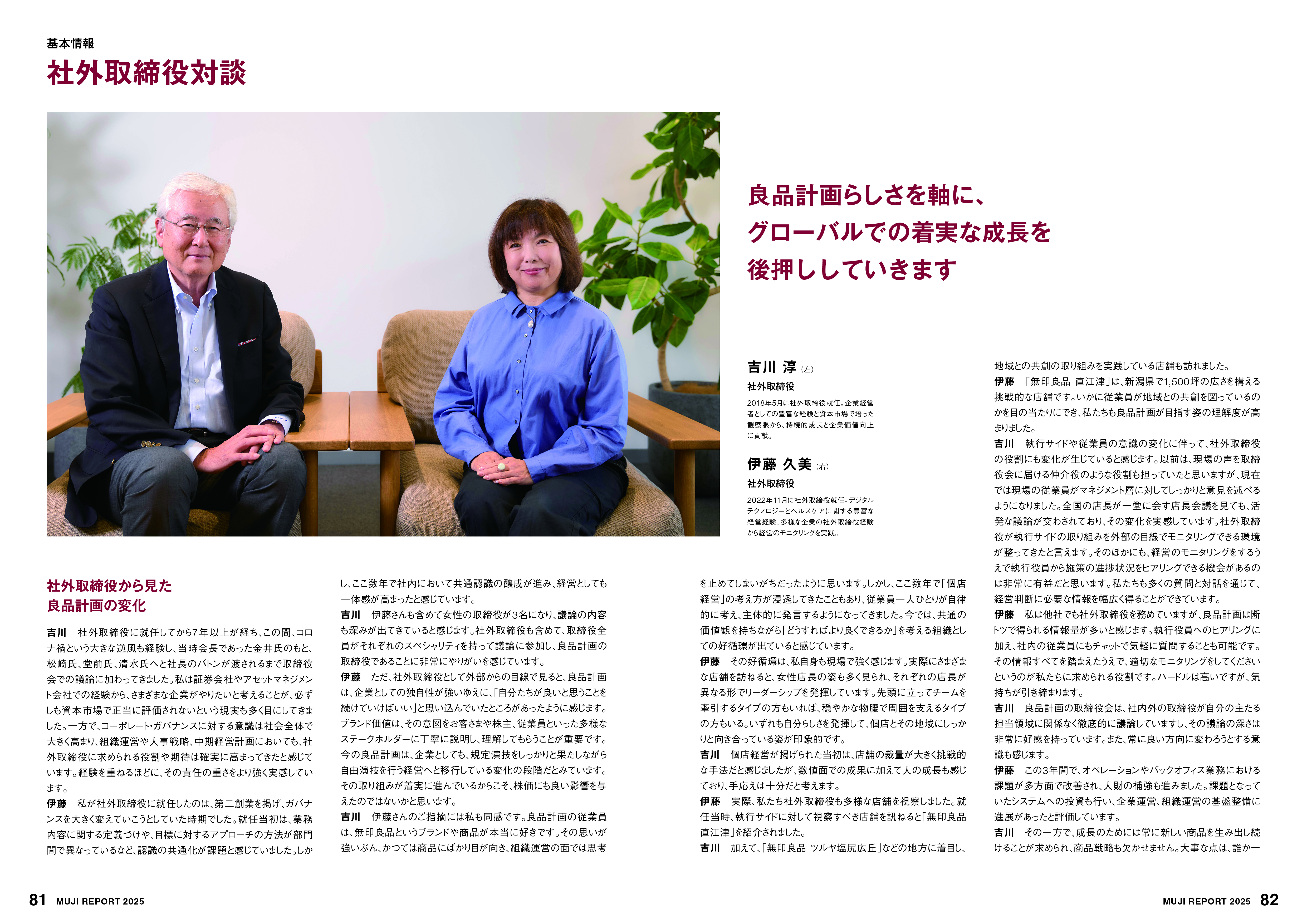 良品計画の社外取締役2名が、それぞれの視点から当社の企業活動を振り返り、今後のグローバル成長に向けたポイントについて対談形式で語っています。