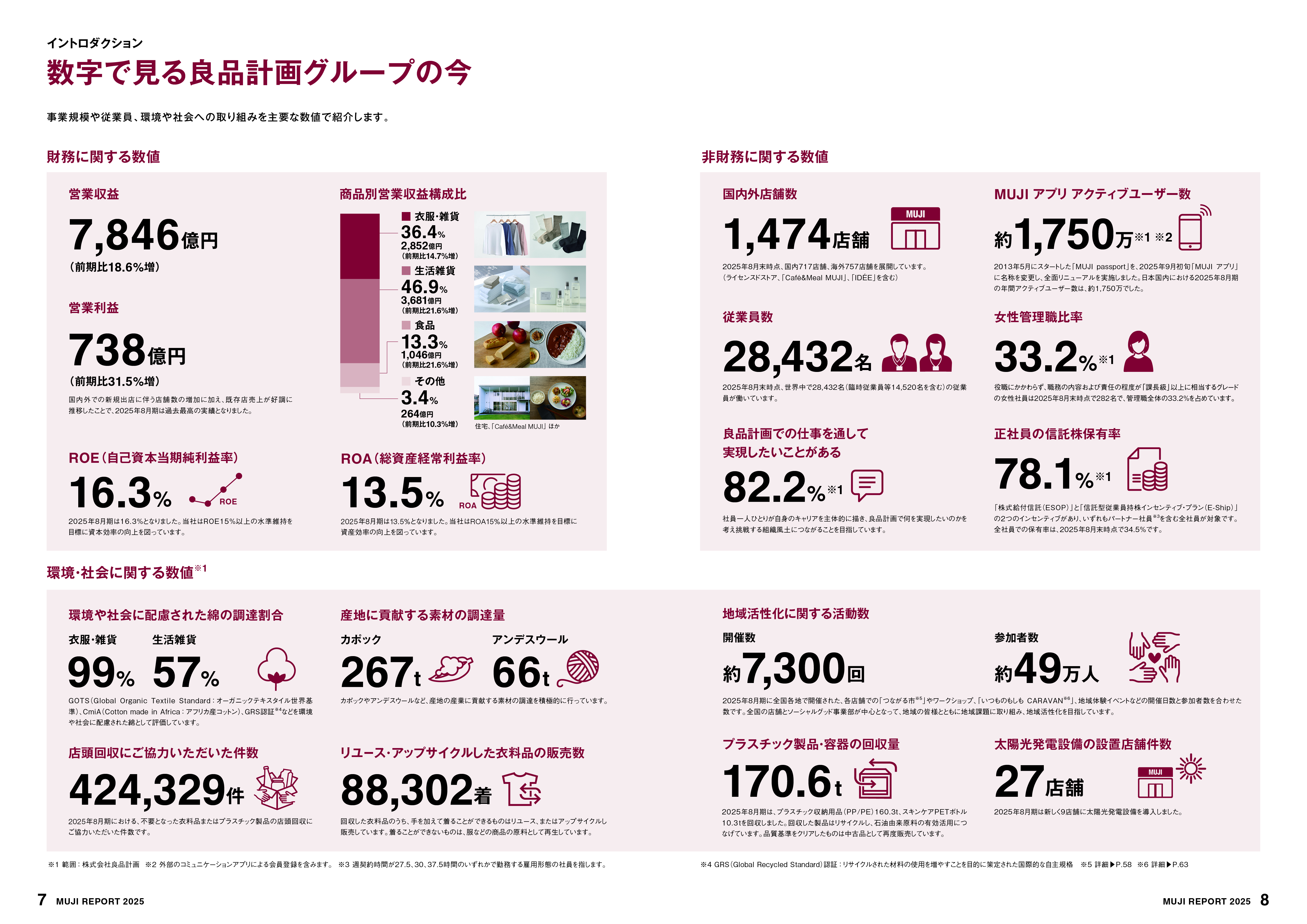 良品計画の財務、非財務、環境・社会に関する実績を数値で報告しています。