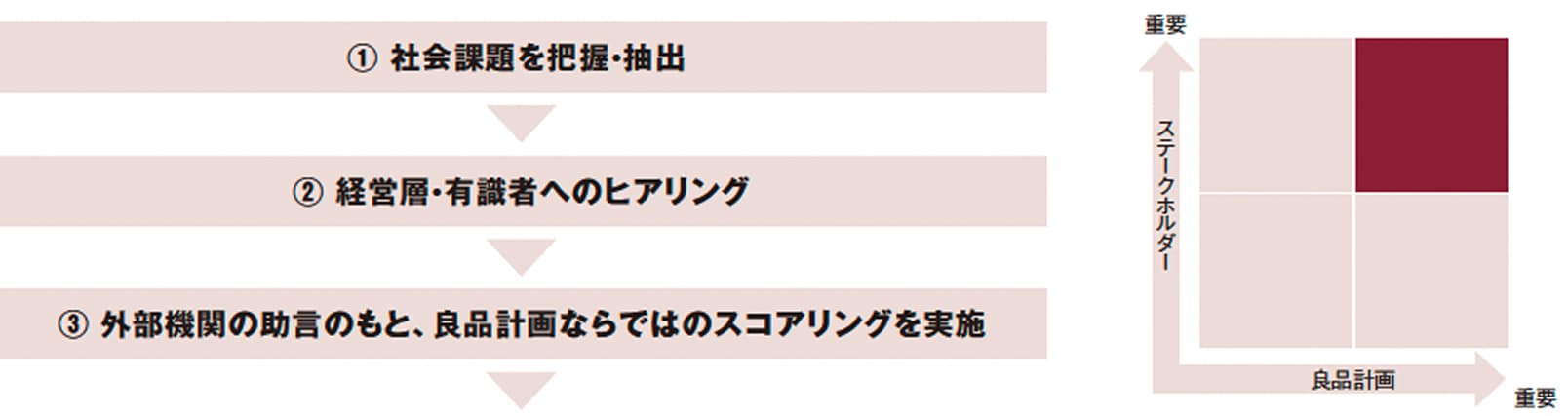 良品計画は、2030年に向けたESG戦略を検討するため、以下のプロセスで重要課題の特定を行っています。